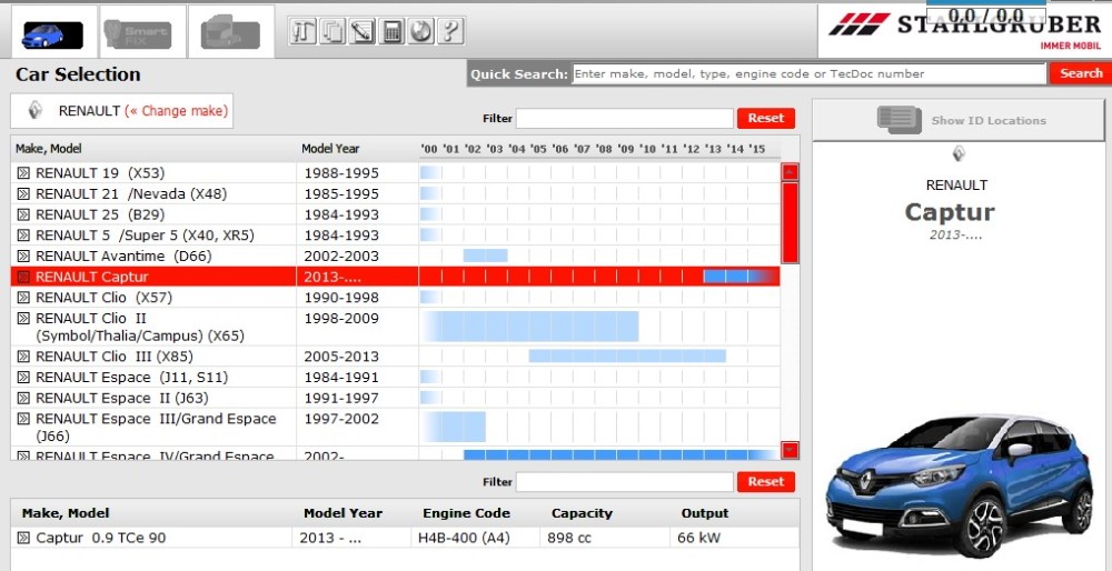 ATRis Stahlgruber provides information on spare parts for cars and trucks. Data on passenger cars, starting from the 60’s, on cargo from the 80’s. Since 2006, the program has been implemented in the TCD shell and using TCD data, in addition to the information on spare parts, the program has integrated information on the standard hours, refueling capacities, maintenance intervals, timing belt locating marks and identification plates.
