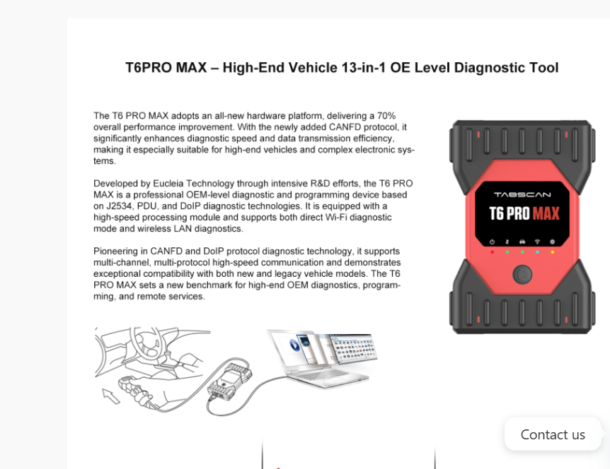 The Eucleia Tabscan T6PRO MAX is a multibrand car diagnostic device that runs original software for major brands (e.g., VAG, BMW, Mercedes, Toyota, Porsche, JLR) — it supports basic functions like reading/clearing DTCs and freeze frame data via OBD, plus advanced features such as coding and flashing updates